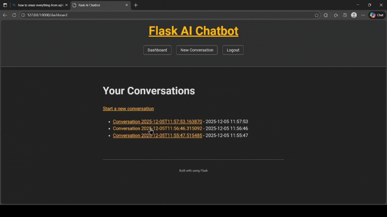 A local-development AI chatbot built with Flask, OpenAI API, and SQLite. Users can register, log in, and hold up to three active conversations with an assistant powered by GPT.